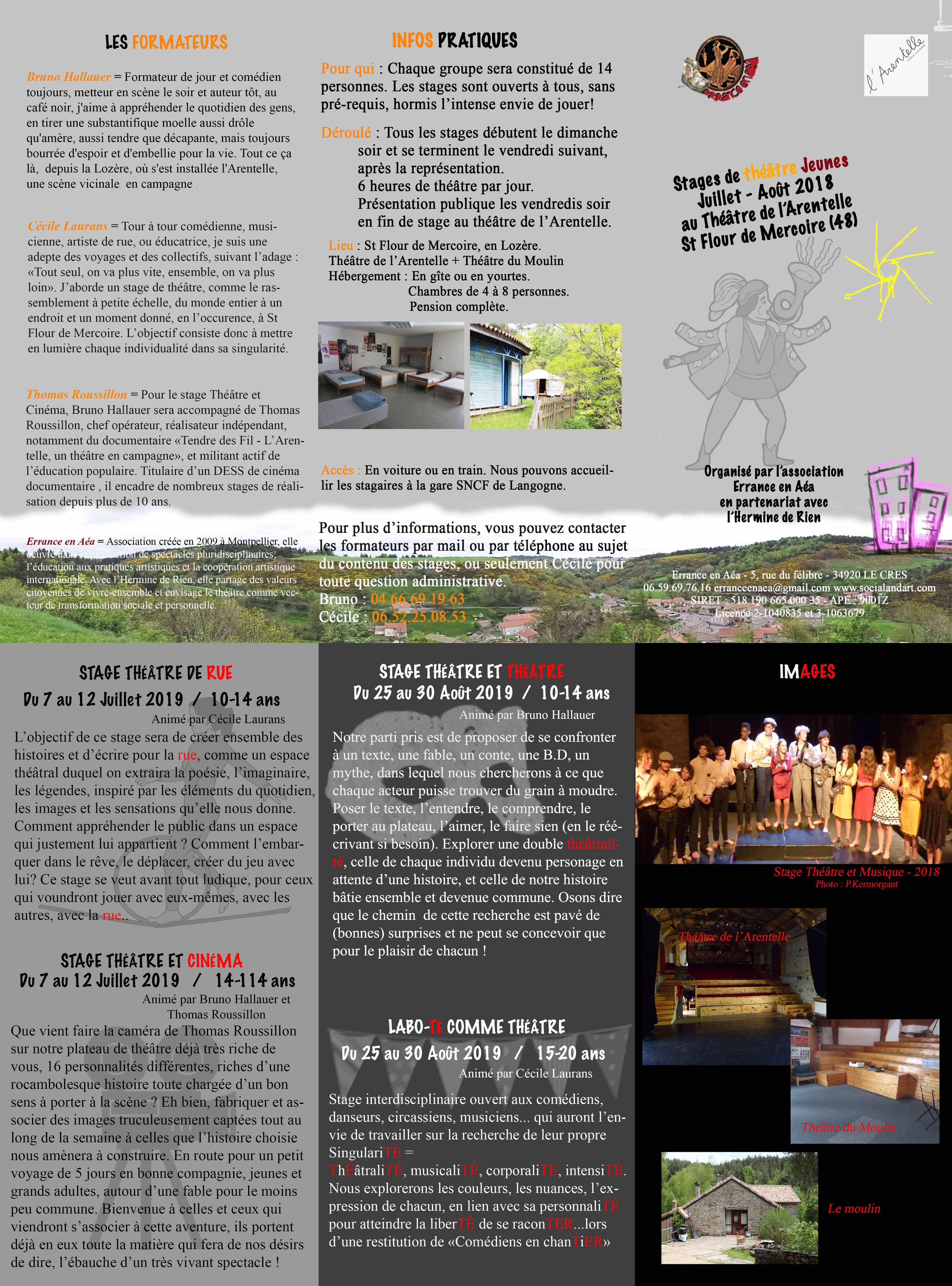 Nous organisons des stages de théâtre pour adolescents et adultes en partenariat avec l'association l'Hermine de Rien à Saint Flour de Mercoire en Lozère depuis 2018. Dans la continuité des stages Polymômes, créés il y a plus de 15 ans par notre partenaire, nous proposons depuis 2 ans, plusieurs temps de recherche individuelle et collective autour du théâtre et d'autres disciplines du spectacle vivant. Des spectacles sont créés et joués en public à l'issue de chaque stage. Le travail s'effectue avec l'accompagnement des formateurs professionnels, dans 2 espaces dédiés = Le théâtre du Moulin (Capacité 50 places) et le Théâtre de l'Arentelle (Capacité 250 places).